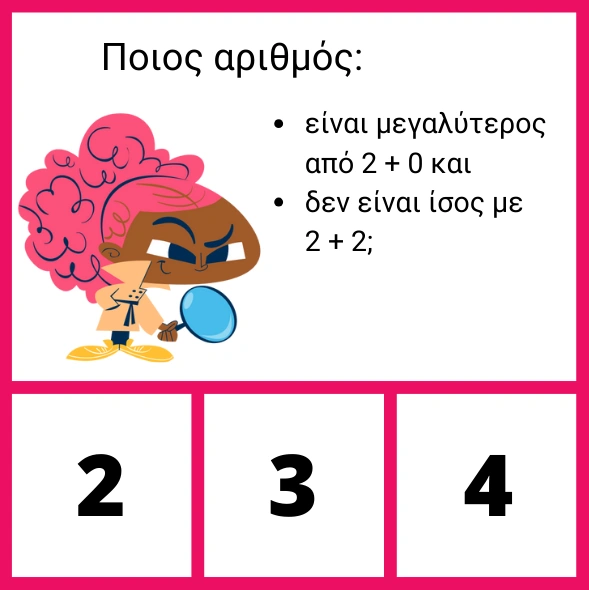 Το παιδί, αφού διαβάσει τον γρίφο μίας κάρτας, καλείται να βρει ποιος αριθμός περιγράφεται, απορρίπτοντας τους άλλους δύο. Έτσι, το παιδί εξασκείται στην πρόσθεση έως το 10 της Α Δημοτικού με ευχάριστο τρόπο, χωρίς να αισθάνεται ότι διαβάζει.